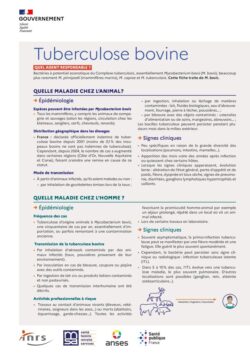 Fiche sur la Tuberculose bovine, réalisée en septembre 2025, qui fournit des informations synthétiques sur les modes de transmission, les principaux symptômes chez l’animal et chez l’Homme et les mesures de prévention recommandées.